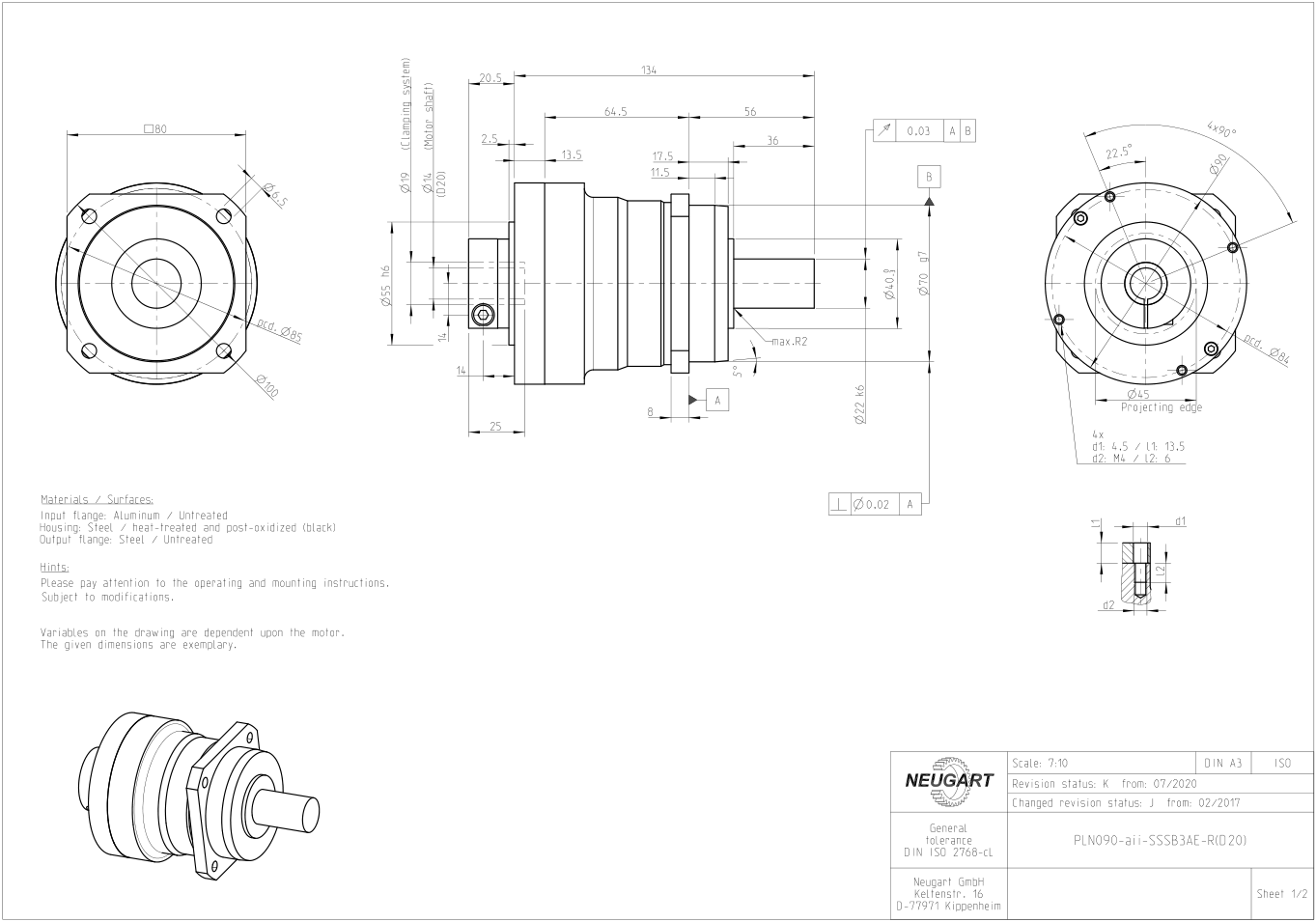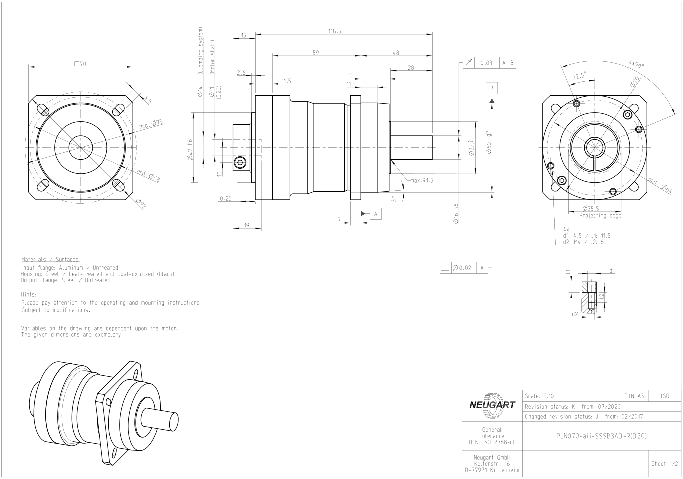 Example of basic dimension drawing of some models of PLN planetary gearbox:Structure and dimension drawing of PLN70 gearbox