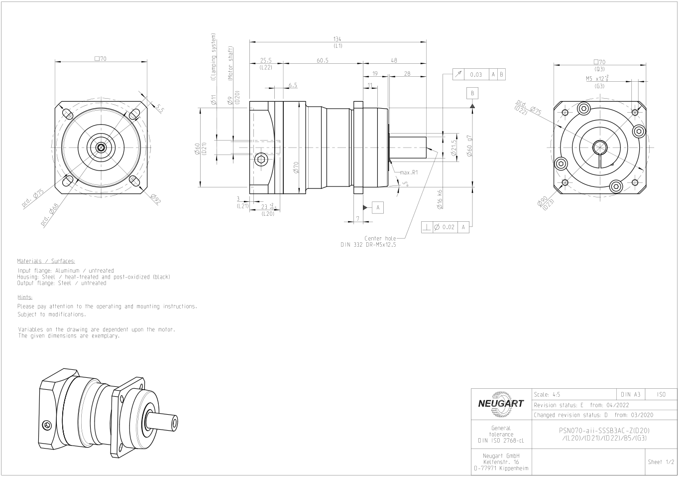 PSN series precision gearbox part model size drawing:Structure and dimension drawing of PSN70 gearbox
